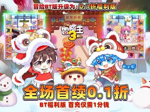 《冒险王3OL(0.1折怀旧服)》是冒险王手游系列的又一新品,传承了冒险王系列手游的经典玩法和美术风格。上线就送免费充值工具,直接免费激活首充,还能激活所有福利卡拿海量资源,每日累充,充全部激活,全场0.1折购买,拿海量金币且激活游戏内大量累充活动,拿极品奖励!每天登录活跃就可领取海量充值卡!百万充值卡上亿彩钻等你来拿!充值卡直接激活贵族VIP!神级还原了吸怪的经典玩法,Q萌Boss满身神装等你爆,还有数千种时尚搭配。神秘的未知大陆,Q萌的冒险世界,快来和小伙伴们一起找回最初的快乐吧!