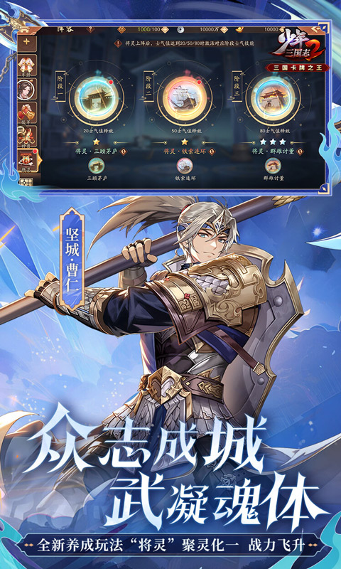 正当少年,不负三国!由游族网络自研打造的现象级手游《少年三国志》正统续作——《少年三国志2》震撼袭来,在传承经典卡牌的基础上,融入国漫元素,打造出了极具年轻感的画面,并推出了名将传、兵符合击等多重创新玩法,强力酷炫的合击技能,自由组合武将,打造专属于你的三国阵容,为战斗带来无限可能!开启了热血三国的全新世界 【福利介绍】 1、登录即送100连抽、酷炫时装,更有天金神装、天金神将大放送 2、新服专属福利,等级达到10级,直送100连抽 3、七日活动豪礼相送、完成任务兑换赤金神将 4、全民冲击赛,贵族经验、海量奖励免费送